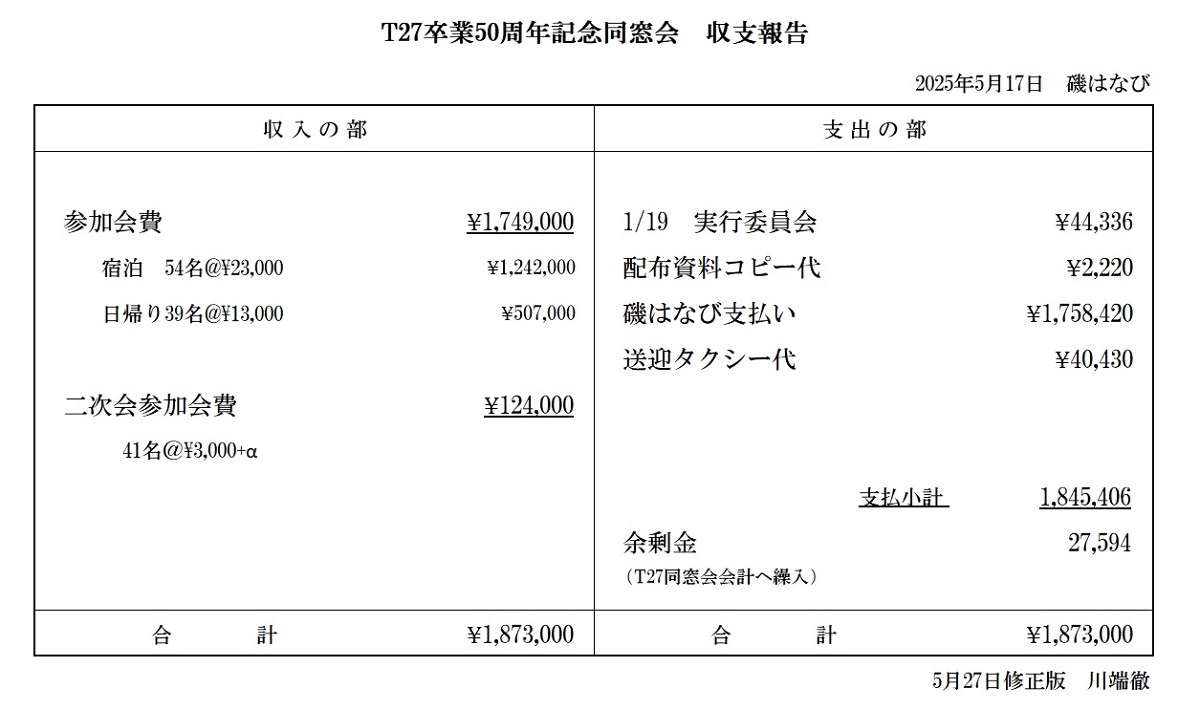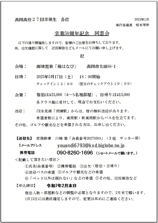 5月17日(土)18時から、雨晴温泉『磯はなび』の2階『天水の間』にて、T27卒業50周年記念同窓会が開催されました。